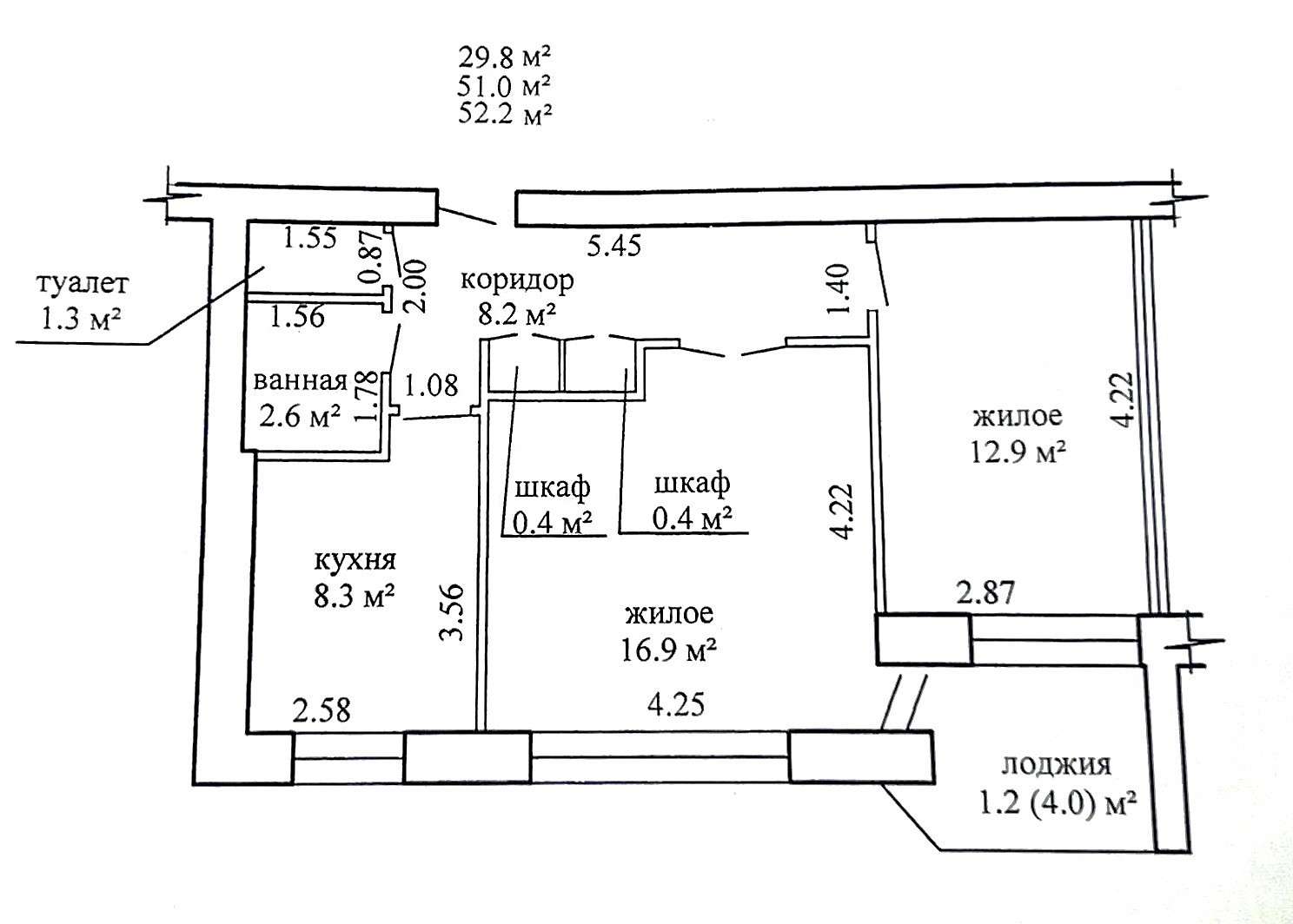 Общая площадь по СНБ – 52,2 м², общая жилая - 51 м², жилая – 29,8 м², кухня – 8,3 м².