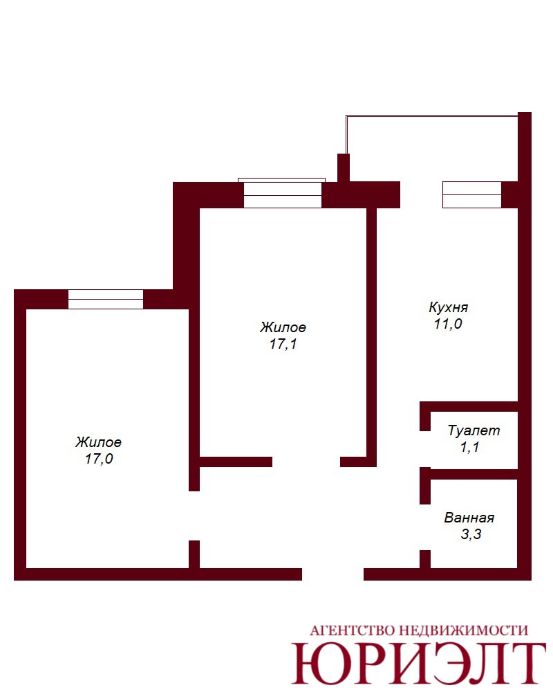 Общая площадь 62,0 м2, две изолированные жилые комнаты площадью 17,1 м2 и 17,0 м2, кухня площадью 11,0 м2., раздельный с/у, застекленная лоджия с выходом из кухни.