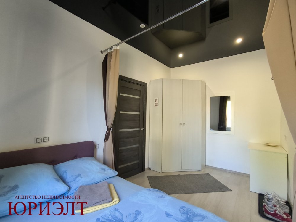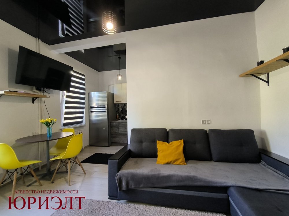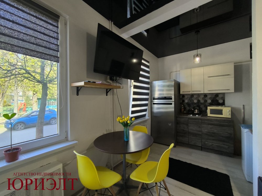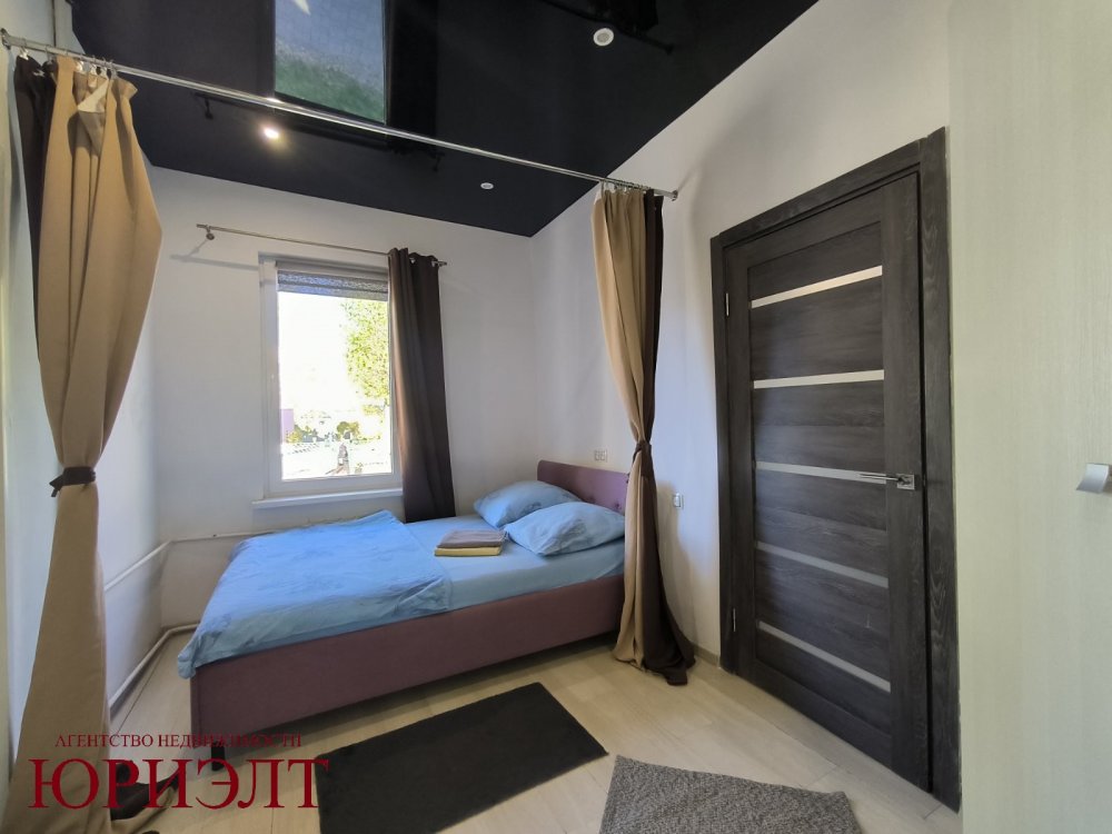 Расположена на 1-м этаже 2-этажного деревянного дома 1920 года постройки, где высота потолка - 2,95 м2. Общая площадь квартиры - 28,1 м2, которая разделена на кухню-гостиную, спальную зону и санузел.