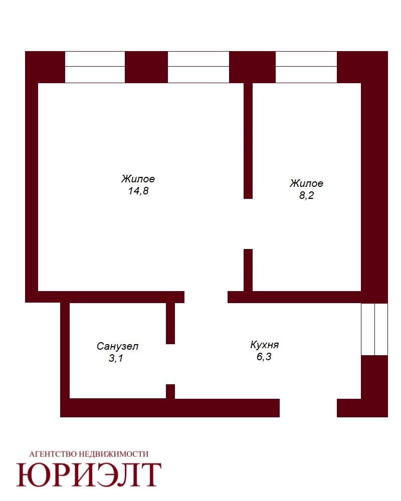 Общая площадь квартиры - 32,4 кв.м., жилая - 23 кв.м., кухня - 6,3 кв.м.