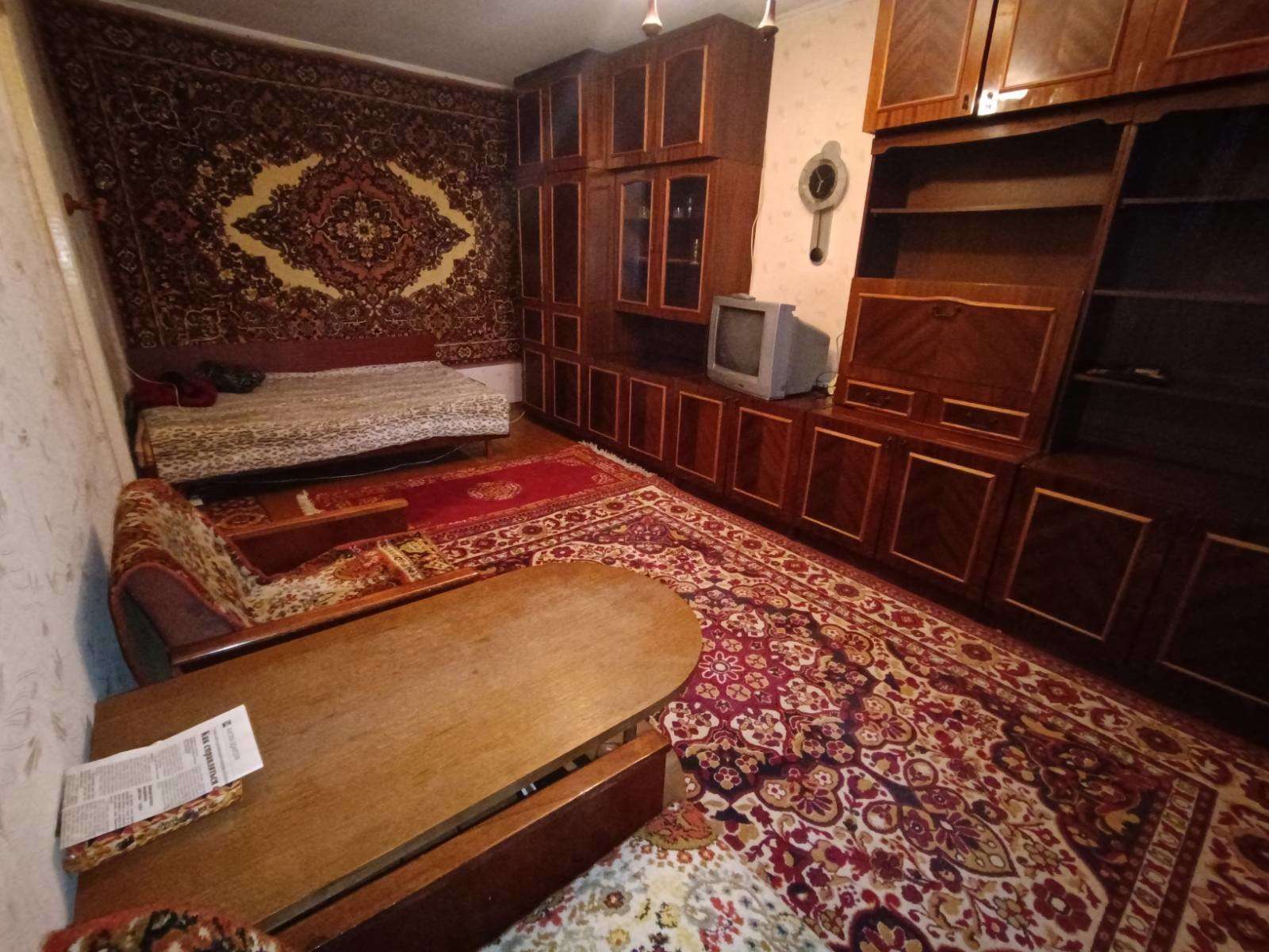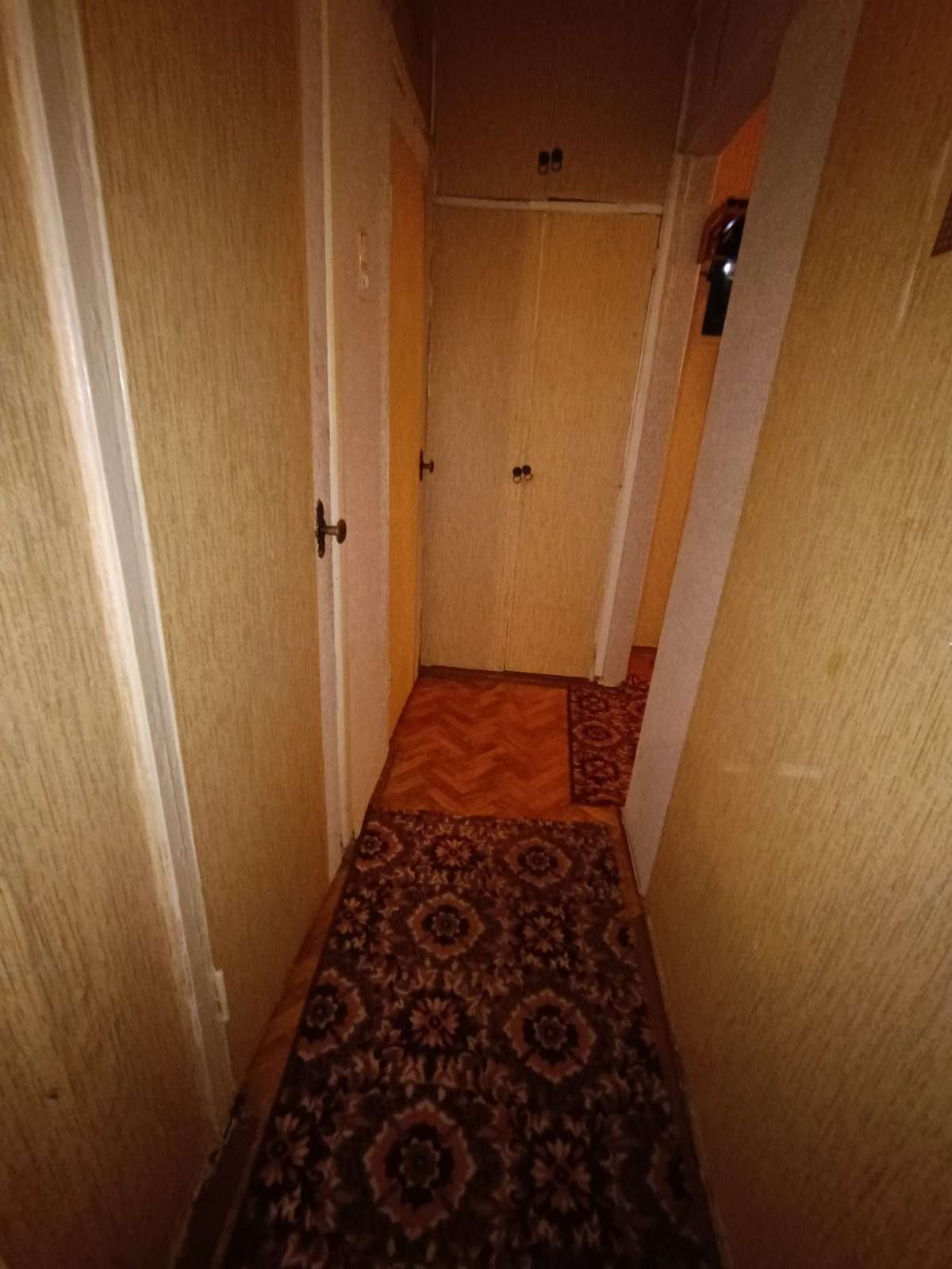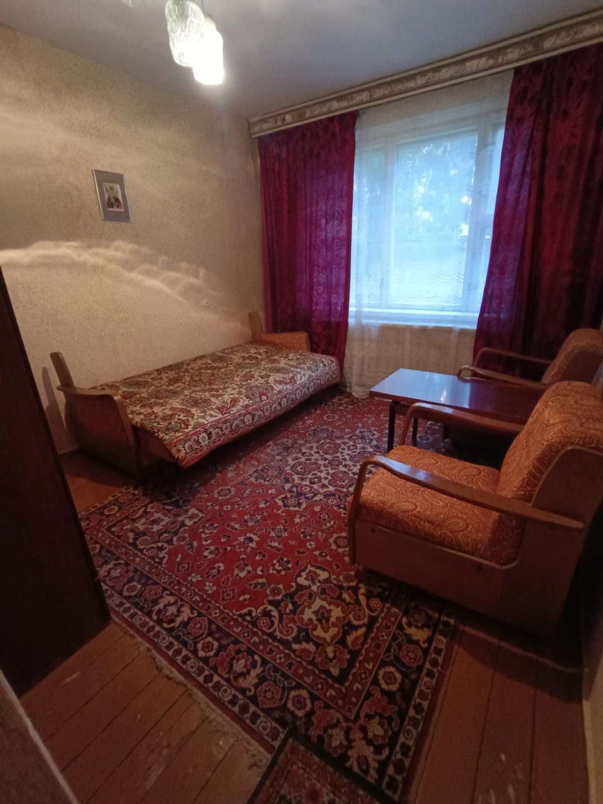Входная дверь - деревянная, межкомнатные двери филенчатые, окна - деревянные рамы, пол - деревянная окрашенная доска, потолок - побелка, на стенах обои. Квартира готова к ремонту!