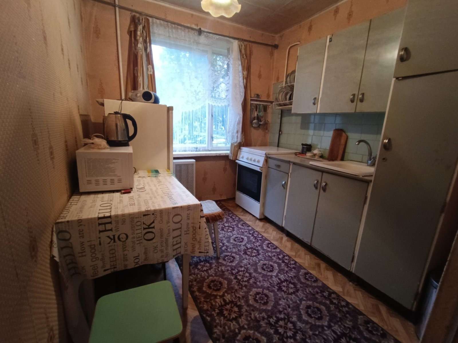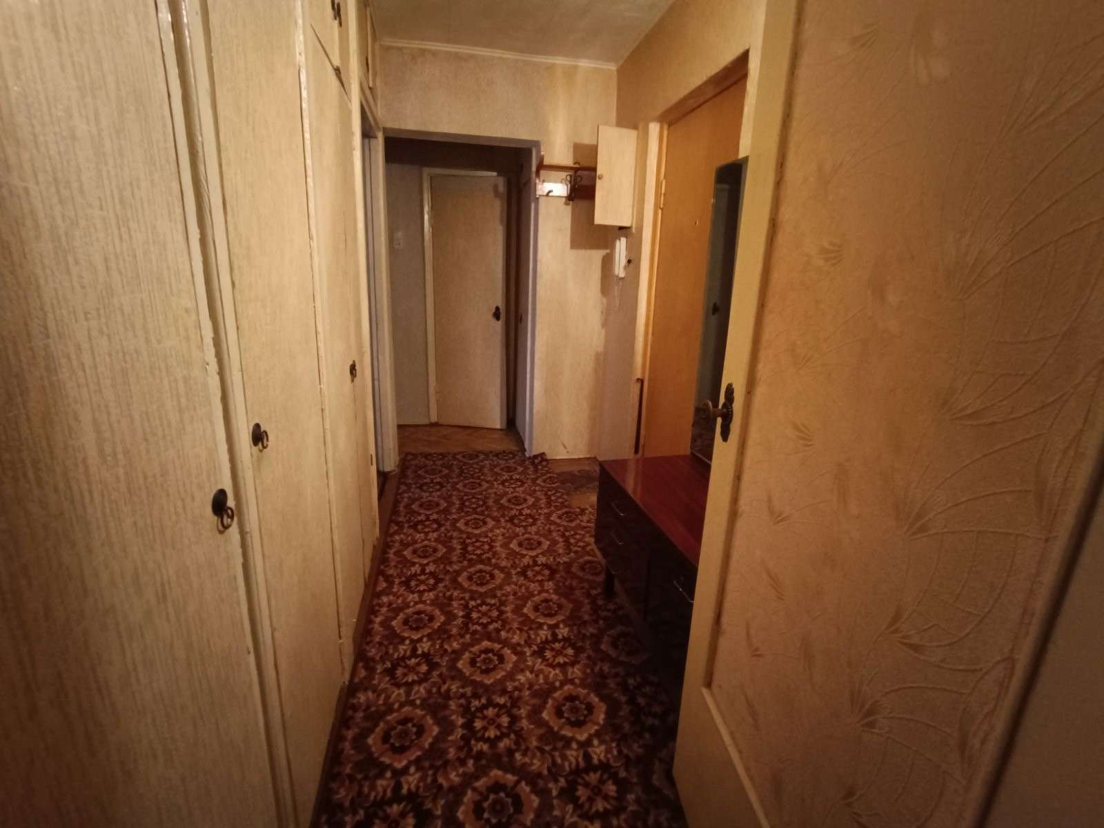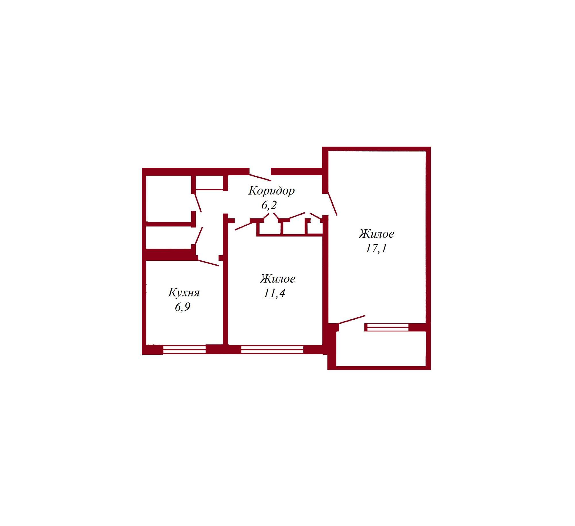 Входная дверь - деревянная, межкомнатные двери филенчатые, окна - деревянные рамы, пол - деревянная окрашенная доска, потолок - побелка, на стенах обои. Квартира готова к ремонту!