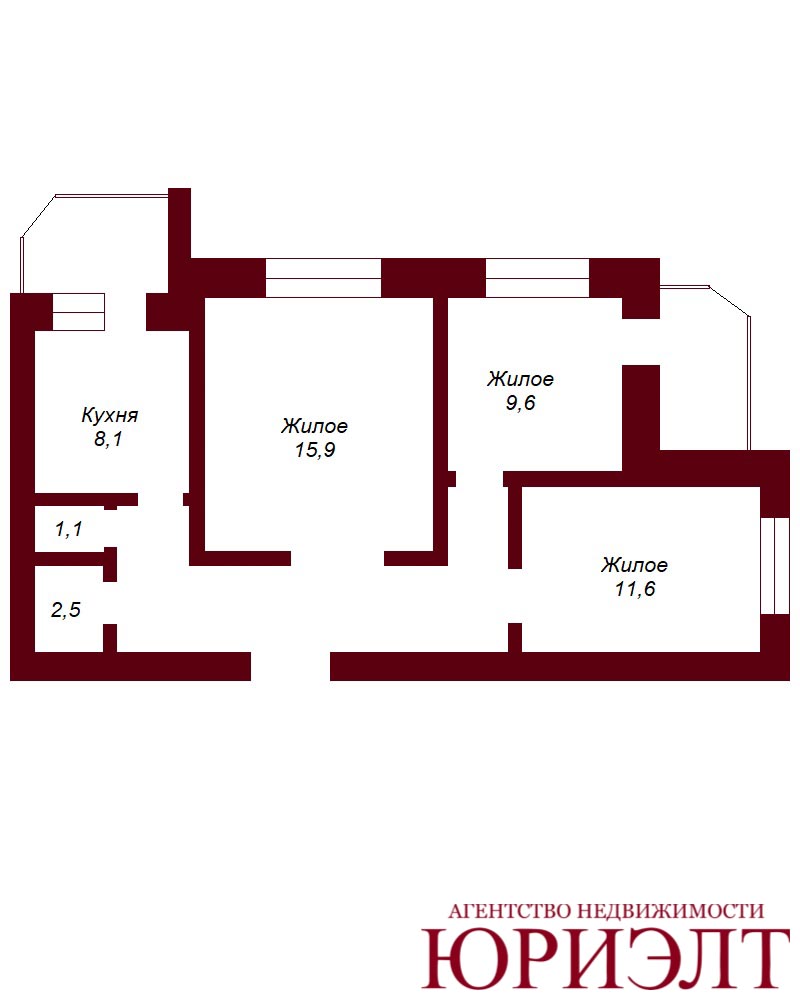 Площади квартиры: СНБ - 63,8 м2, общая площадь - 61,8 м2, жилая - 37,1 м2.