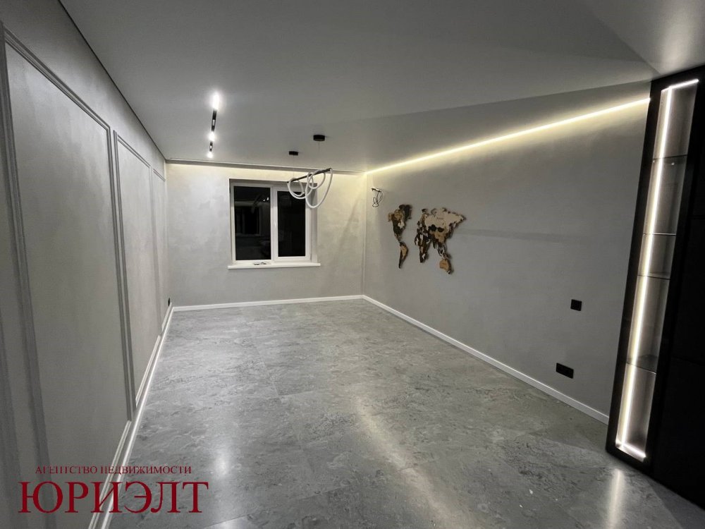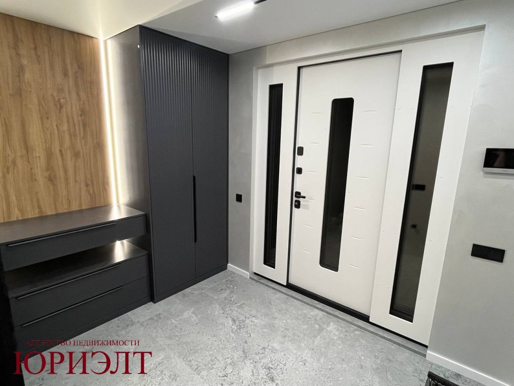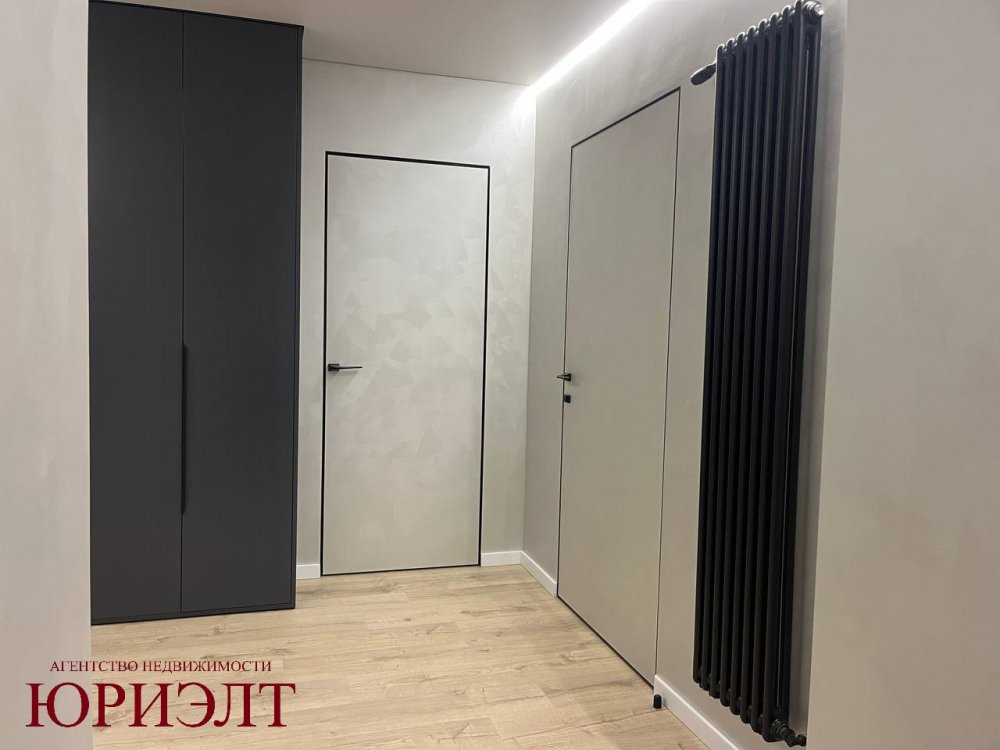Роскошная отделка: Итальянская плитка 120x120 см, двери скрытого монтажа, дизайнерские черные радиаторы, плинтусы из дюрополимера.